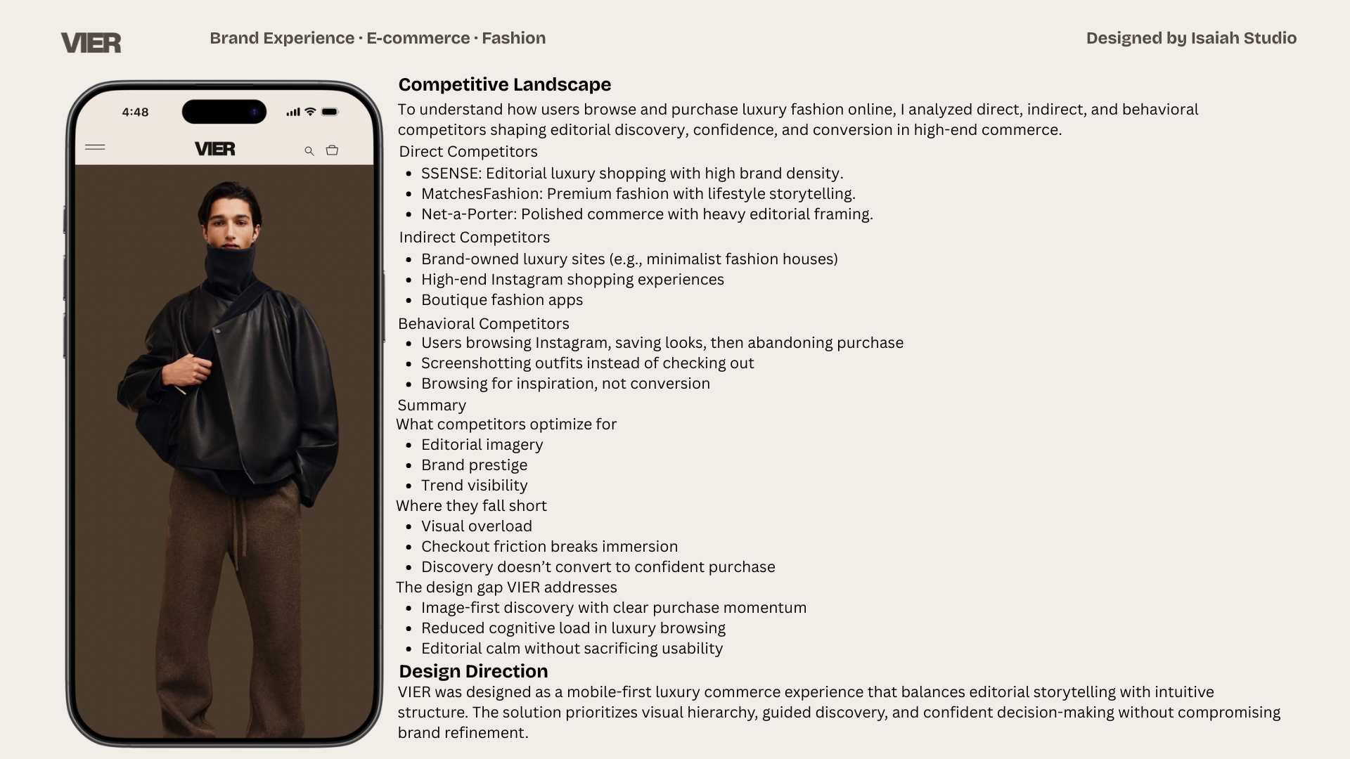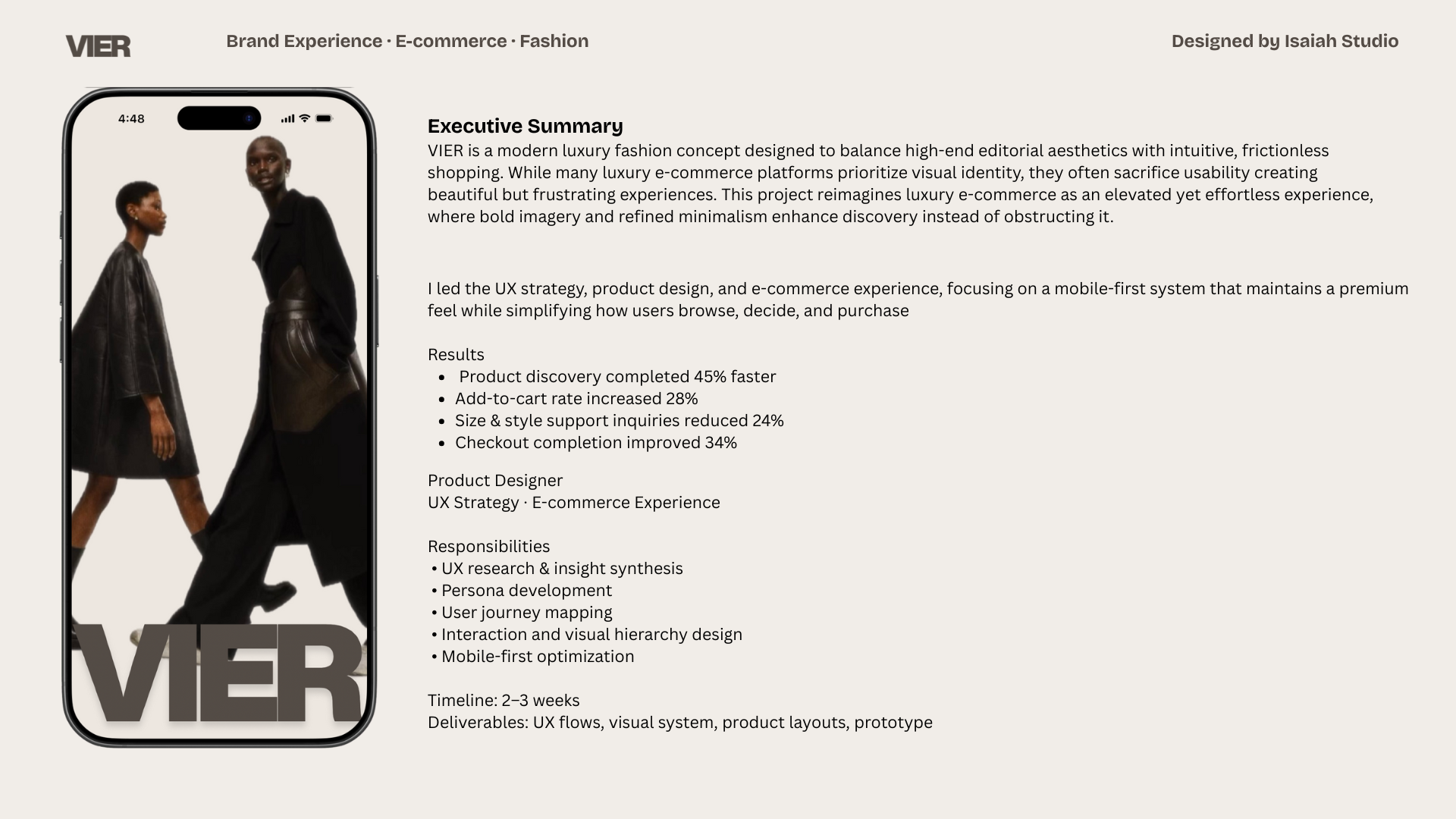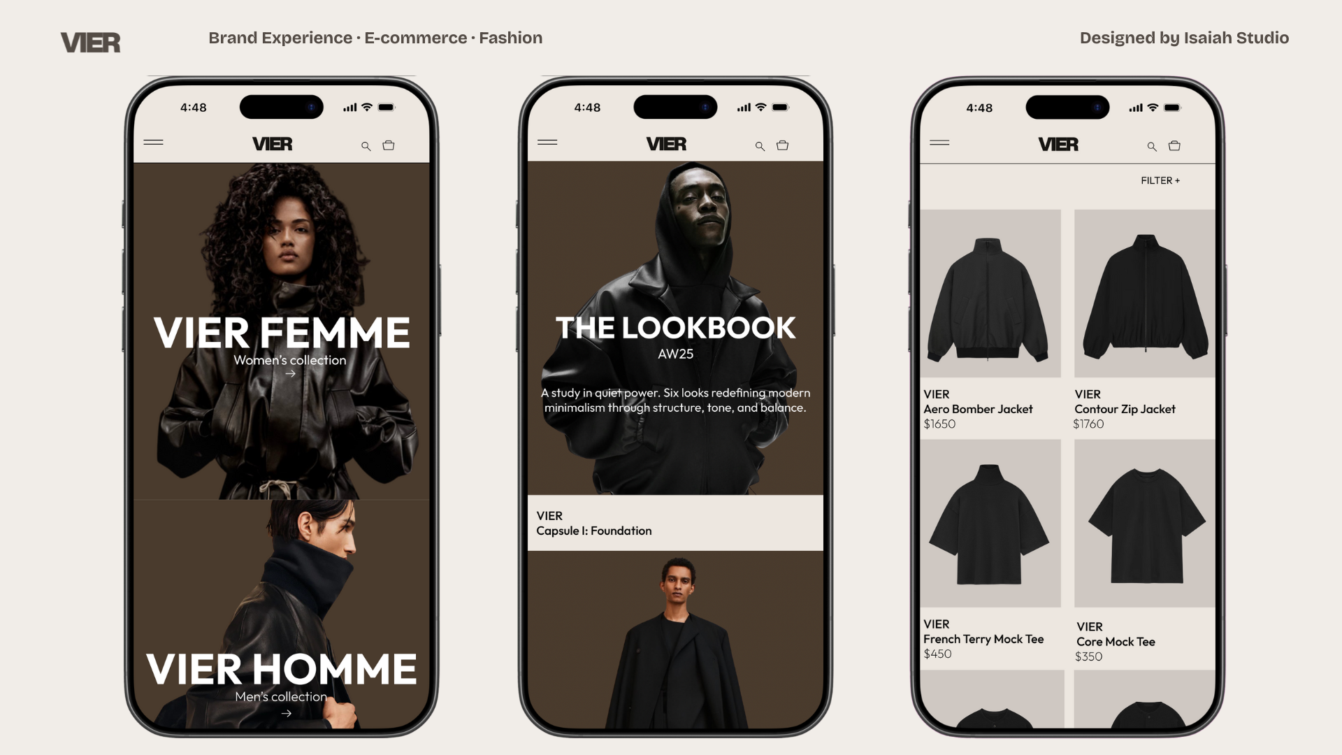 VIER is a high-fashion e-commerce concept designed to balance editorial expression with frictionless mobile shopping. The project explores how luxury brands can preserve visual identity while improving discovery, confidence, and conversion through intentional restraint and clarity.