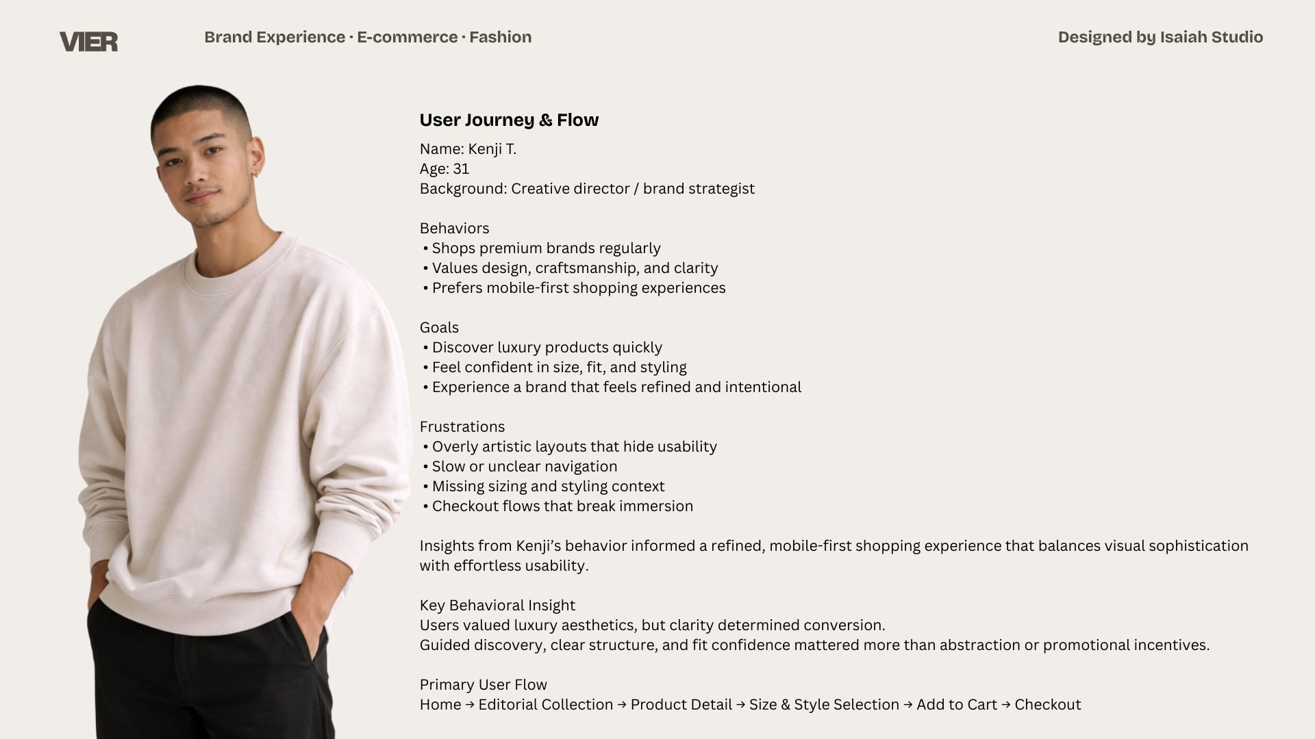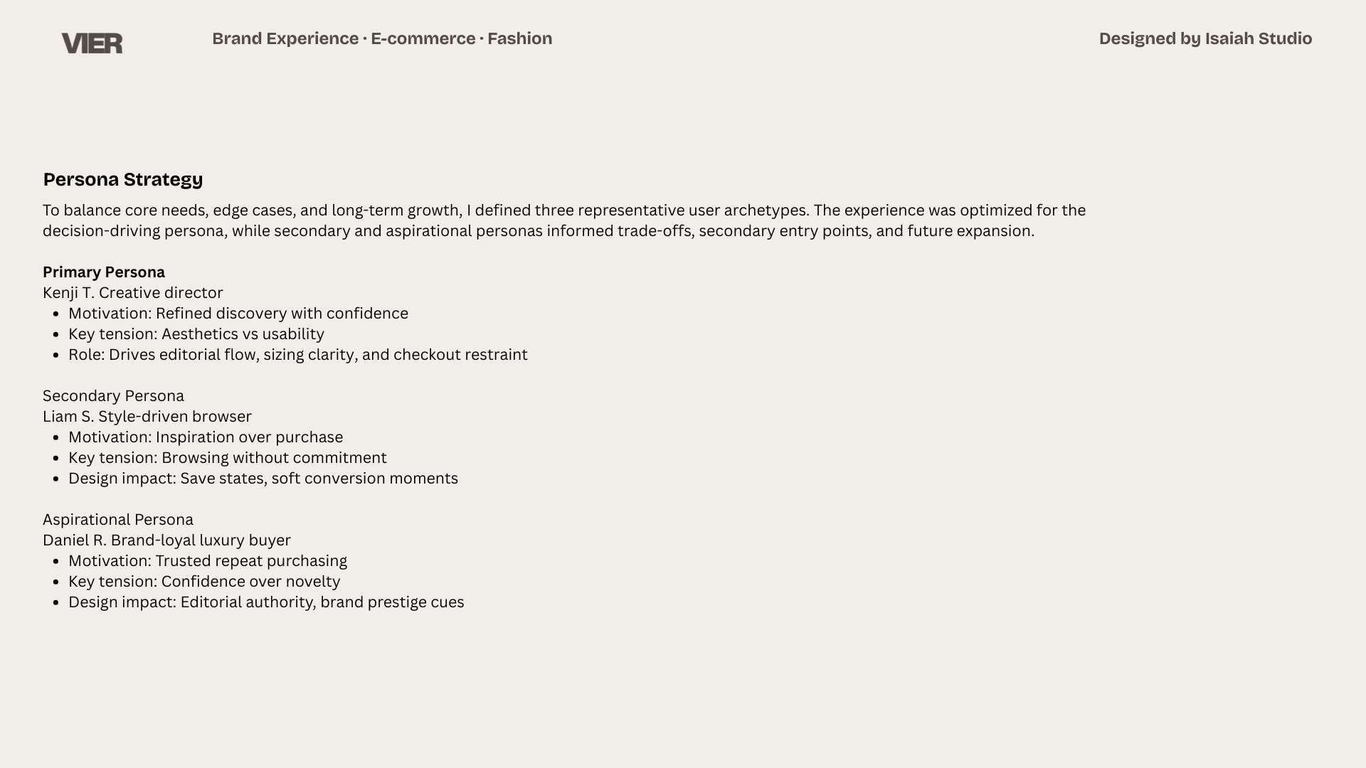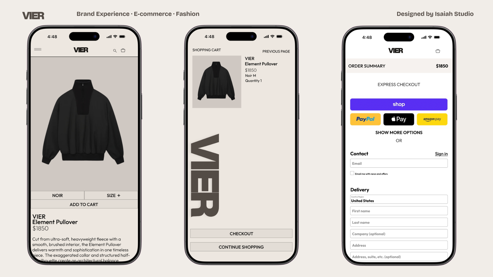 VIER is a high-fashion e-commerce concept designed to balance editorial expression with frictionless mobile shopping. The project explores how luxury brands can preserve visual identity while improving discovery, confidence, and conversion through intentional restraint and clarity.